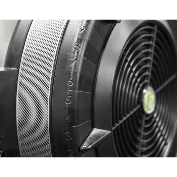 The Concept 2 uses air resistance generated by the fanned flywheel. To adjust how much air enters the flywheel housing on each stroke, the Model D Rower includes a unique spiral damper adjustable from a setting of 1 to 10. This functions much like the gears on a bike, affecting how much energy will be needed to accelerate from one stroke to the next. 10 allows in the most air for more wind resistance. For most people the recommended settings is from 3-5.